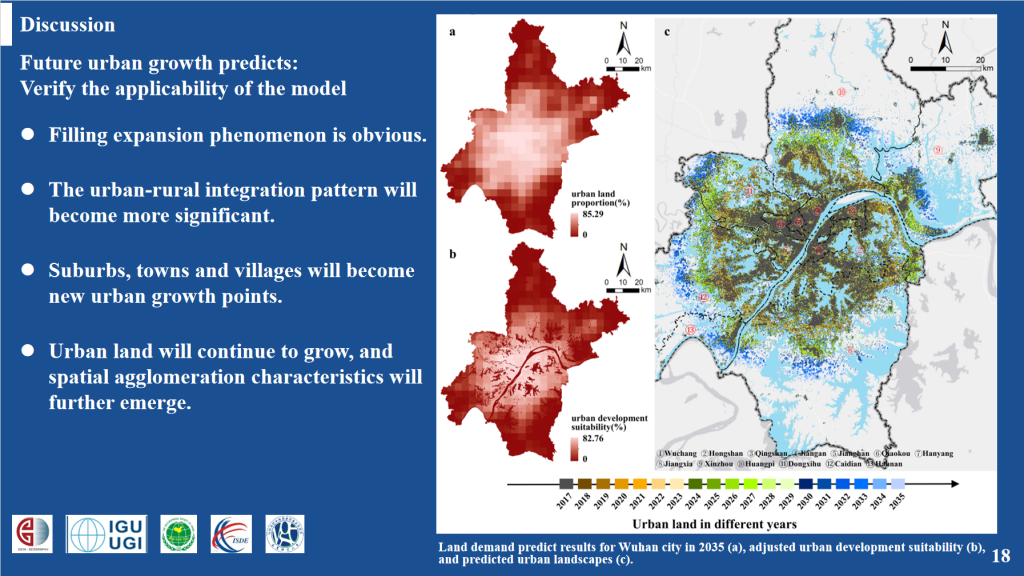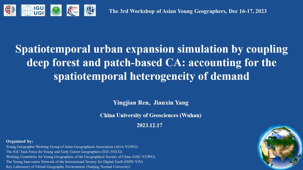团队学生任英健在本次会议上做了题目为“Spatiotemporal urban expansion simulation by coupling deep forest and patch-based CA: accounting for the spatiotemporal heterogeneity of demand”的报告。报告中重点阐述了本研究在城市扩张模拟中所做的贡献,即在城市扩张模拟过程中不仅考虑了时空化的城市土地需求,并且对空间分配过程的城市斑块形状按照距离准则进行调节,在细胞层面和景观层面的模拟结果中都获得了令人更加满意的结果。